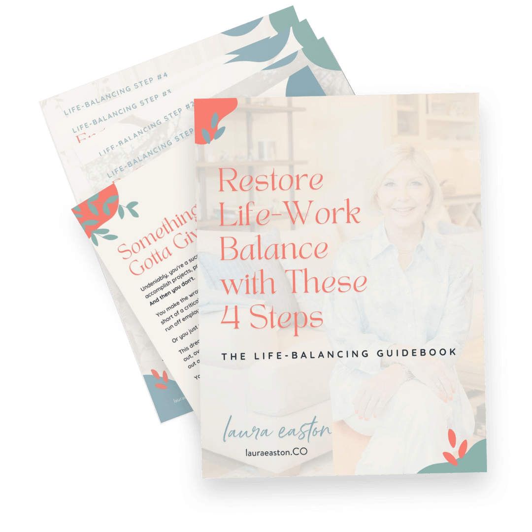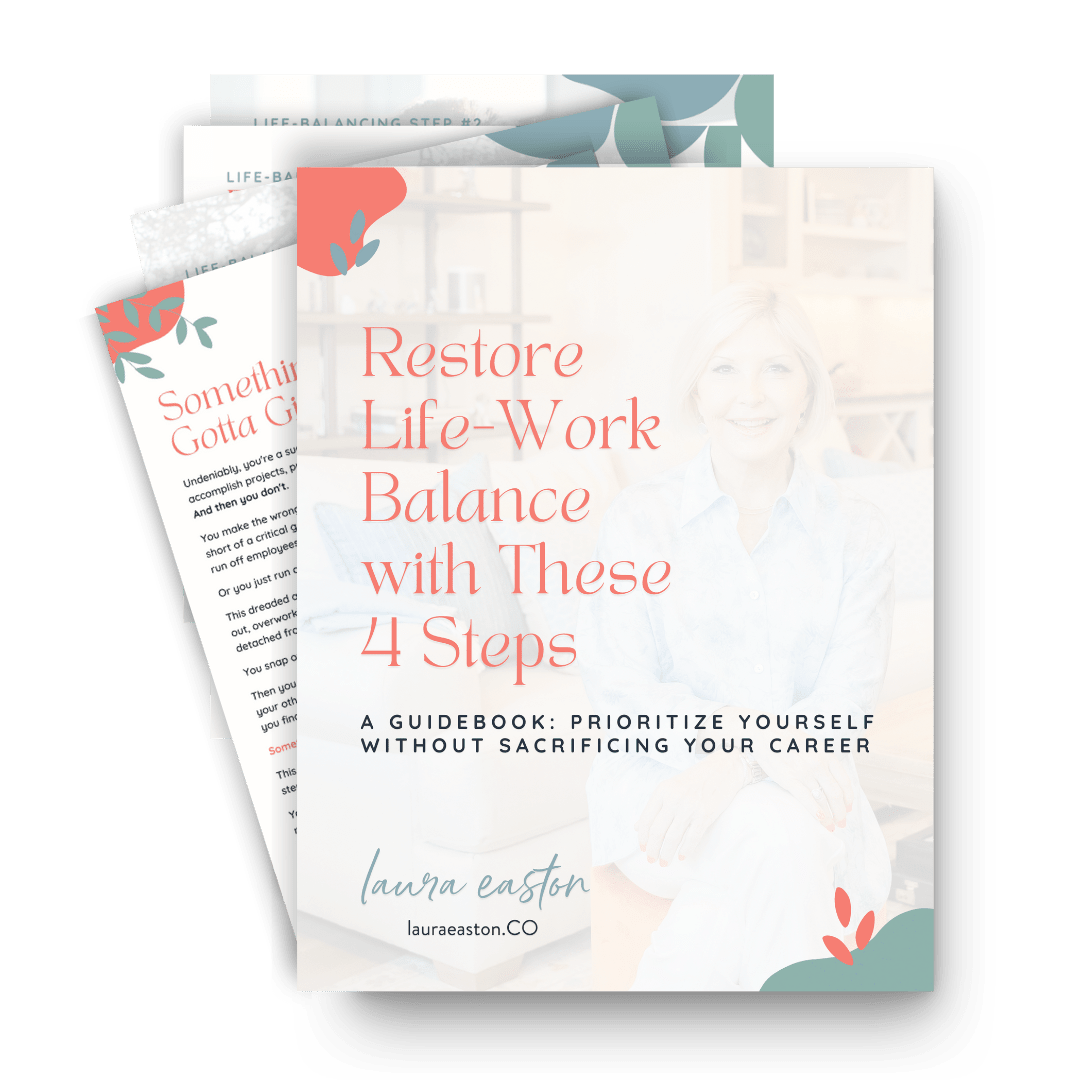 The Restore Life-Work Balance with These 4 Steps Guide has been responsible for allowing my clients to reverse that insidious cycle of overworking, overcommitting, neglecting self-care and trying to do it all (while being secretly scared that balance will cost them their status and success.)